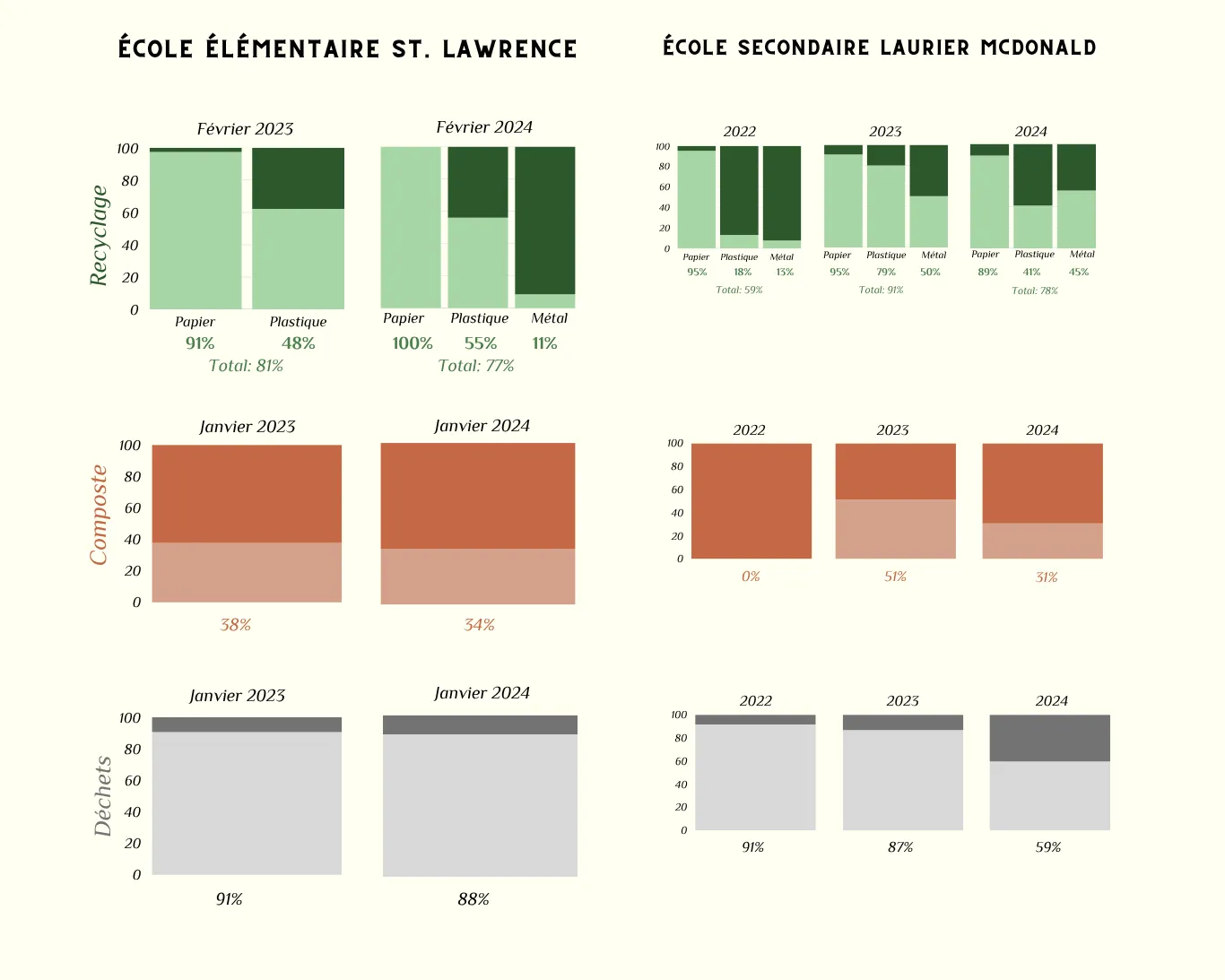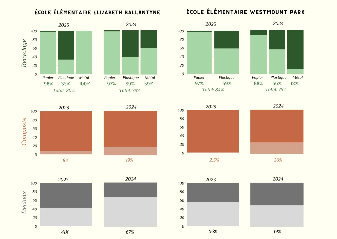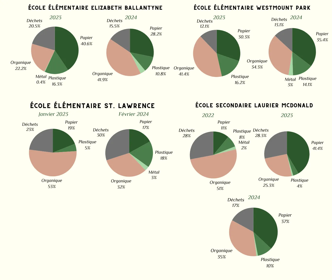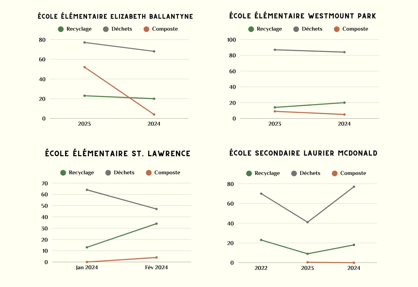 des ateliers éducatifs. Nous sommes fiers d'annoncer que l'audit des déchets a donné des résultats incroyables ! Les taux de contamination des bacs à compost ont considérablement diminué, passant de 52 % en octobre 2023 à seulement 4 % en mars 2024... Je recommande vivement aux autres écoles de suivre le même modèle de transformation avec enuf que l'école élémentaire Elizabeth Ballantyne... J'encourage vivement l'EMSB et les municipalités à fournir les fonds nécessaires à la mise en œuvre de ce projet.